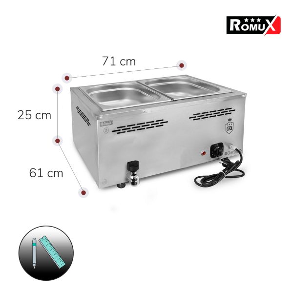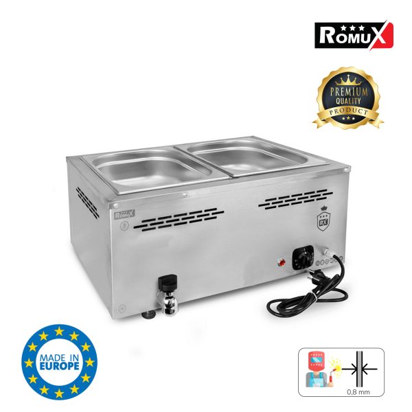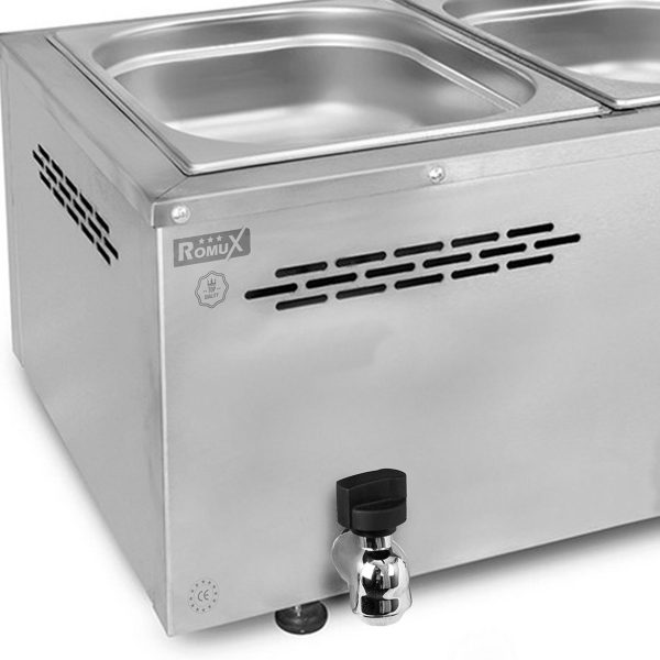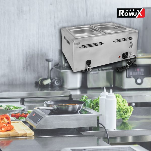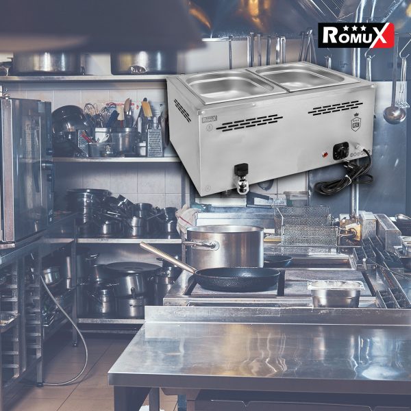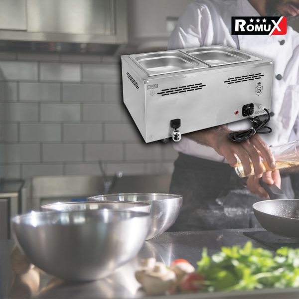 Sin embargo, este no es un problema al comprar el baño maría industrial profesional de 2 cubas de 1/1 GN Romux. Gracias a la profesionalidad que proporciona la marca de fabricación europea el éxito está asegurado al comprar el baño maría industrial profesional de 2 cubas de 1/1 GN Romux.