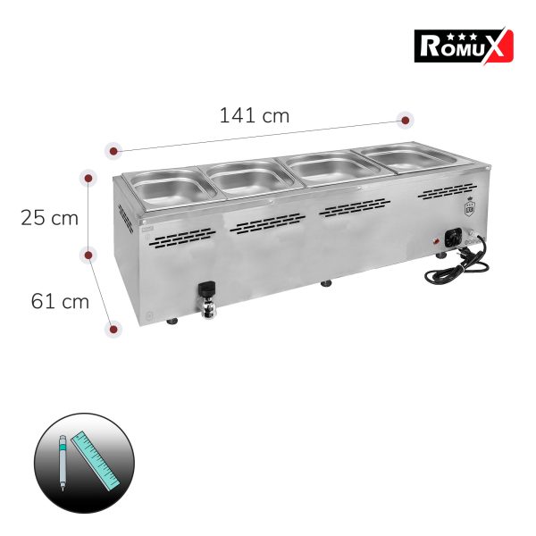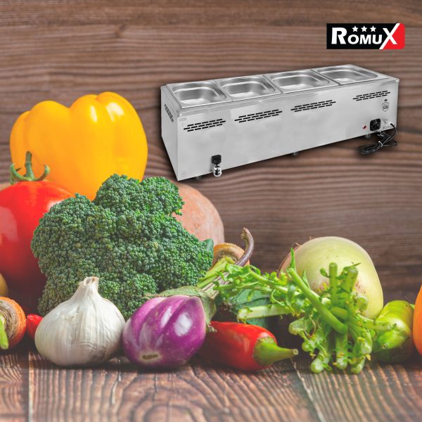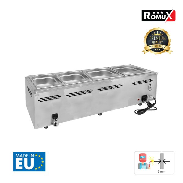 Sin embargo, este no es un problema al comprar el baño maría industrial profesional de 4 cubas de 1/1 GN Romux. Gracias a la profesionalidad que proporciona la marca de fabricación europea el éxito está asegurado al comprar el baño maría industrial profesional de 4 cubas de 1/1 GN Romux.