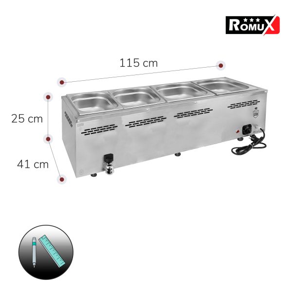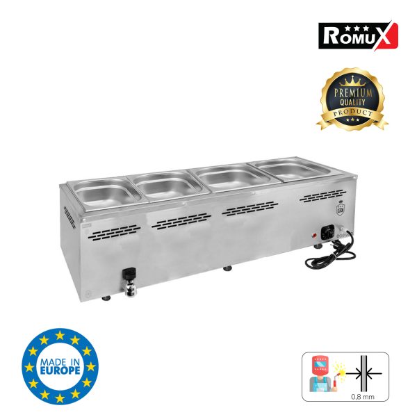 Sin embargo, este no es un problema al comprar el baño maría industrial profesional de 4 cubas de ½ GN Romux. Gracias a la profesionalidad que proporciona la marca de fabricación europea el éxito está asegurado al comprar el baño maría industrial profesional de 4 cubas de ½ GN Romux.